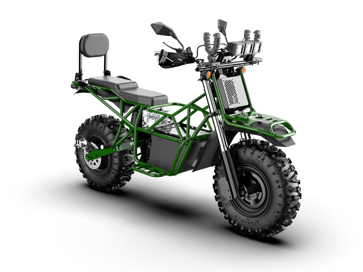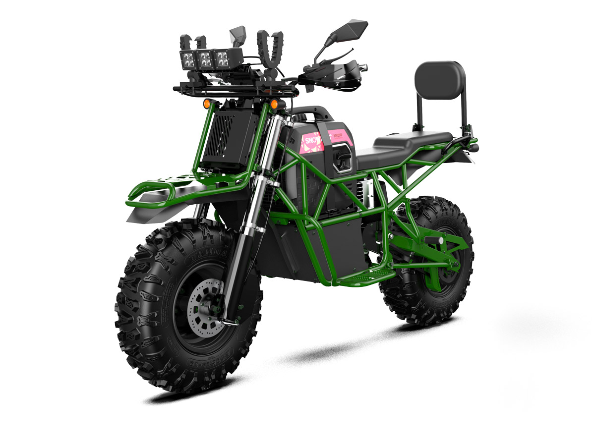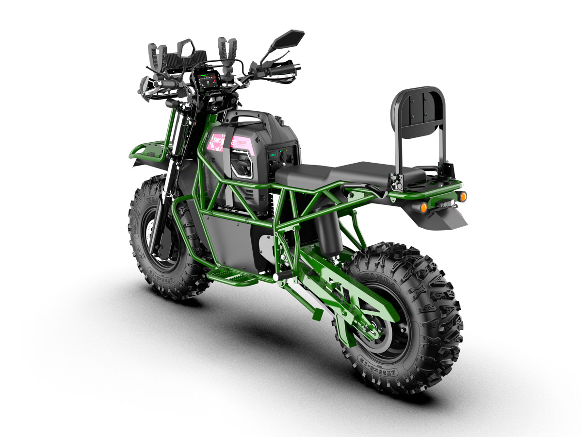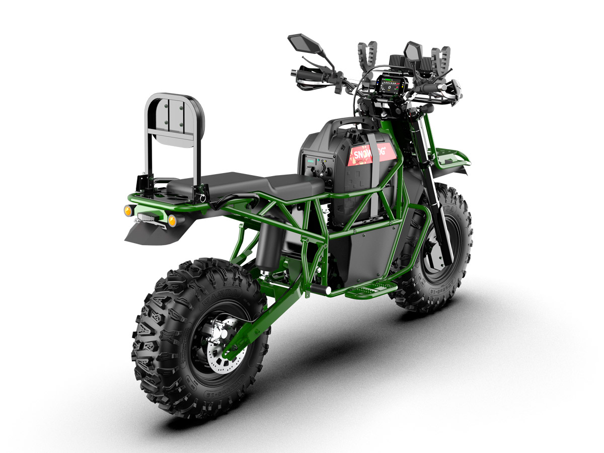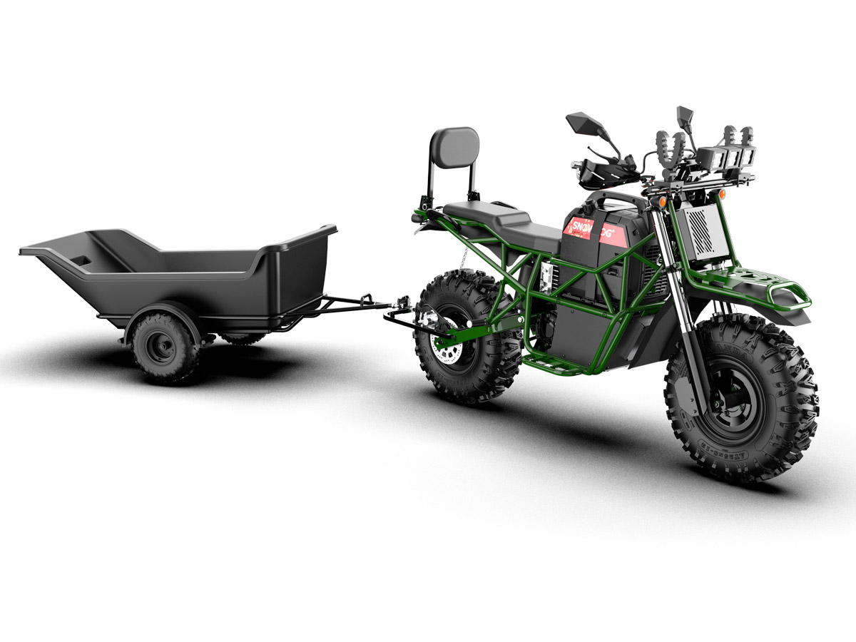 Bulldog is a large, 2-seater electric motorcycle developed by the American company, Snowdog LLC. It offers benefits of both a motorcycle and an ATV. Onboard 2 kW generator allows you to charge the battery right on the move which makes it possible not to worry about the range that is up to 4 hours in combined mode.