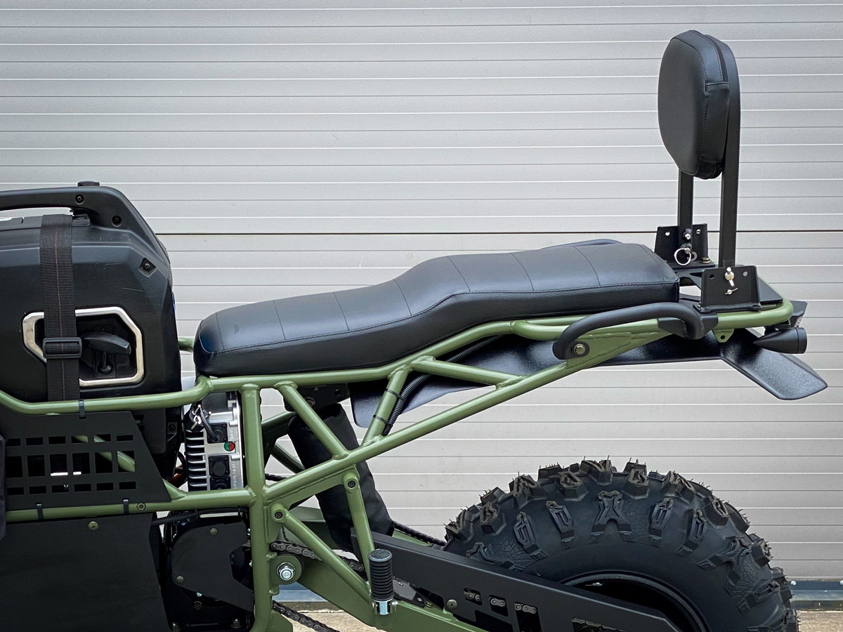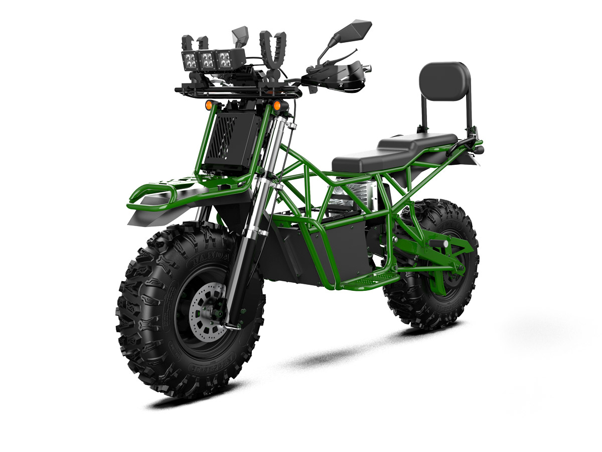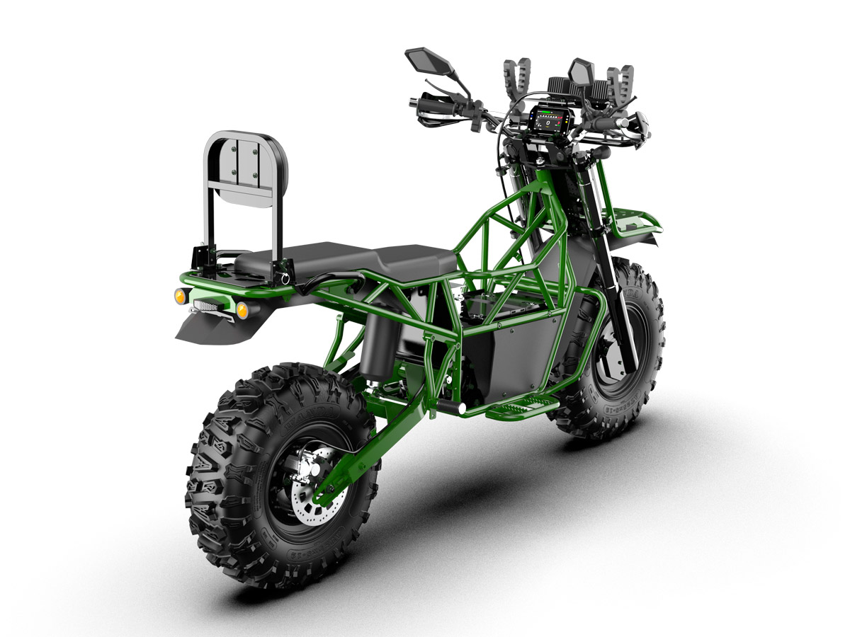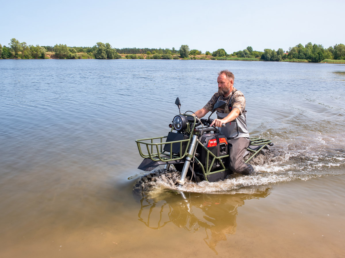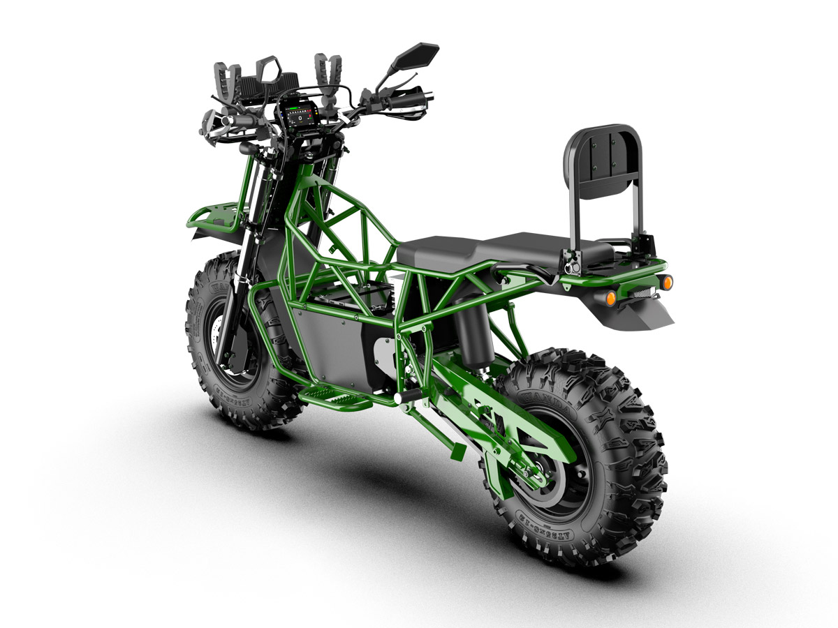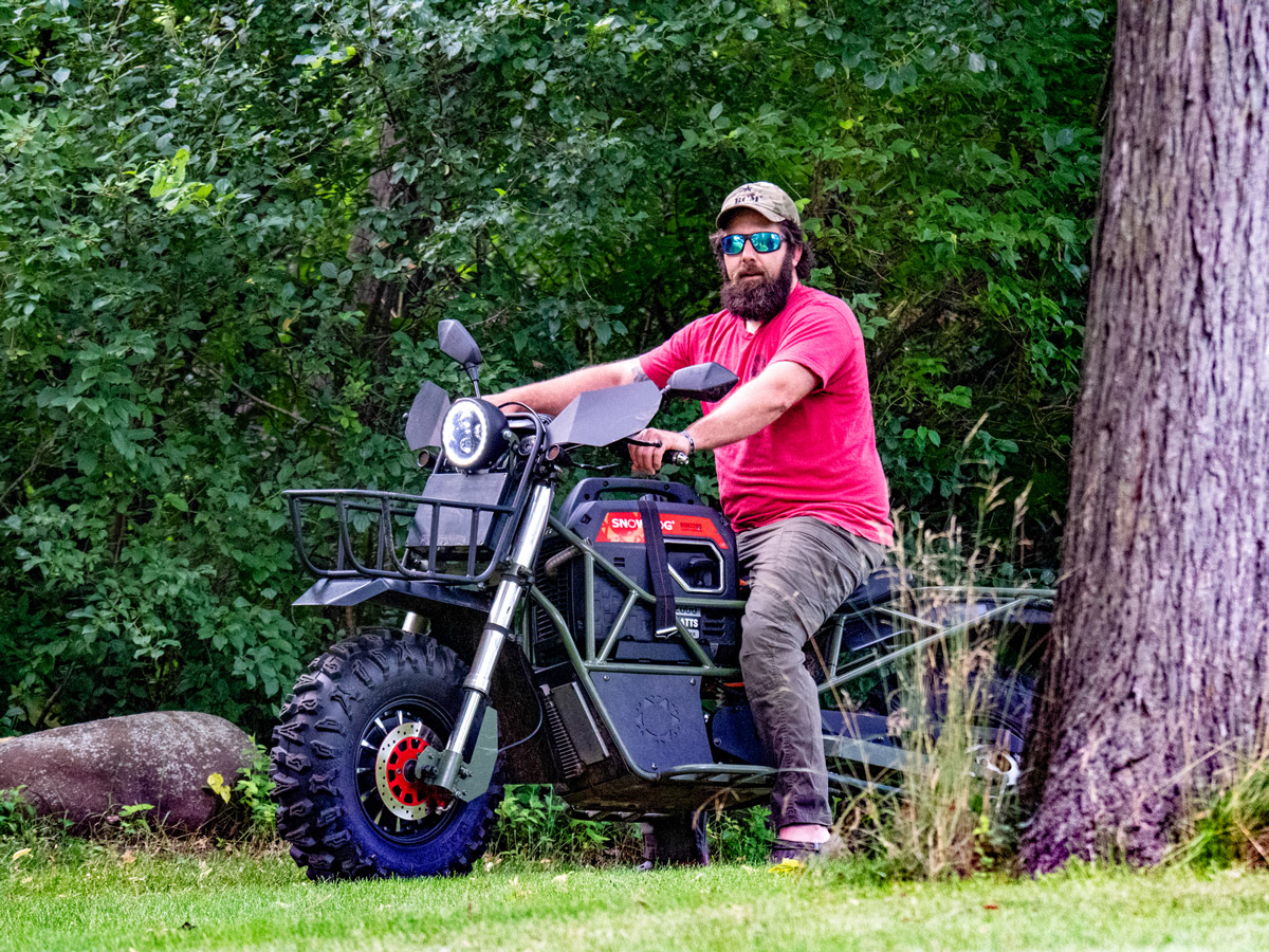Bulldog is a large, 2-seater electric motorcycle developed by the American company, Snowdog LLC. It offers benefits of both a motorcycle and an ATV. Onboard 2 kW generator allows you to charge the battery right on the move which makes it possible not to worry about the range that is up to 4 hours in combined mode.